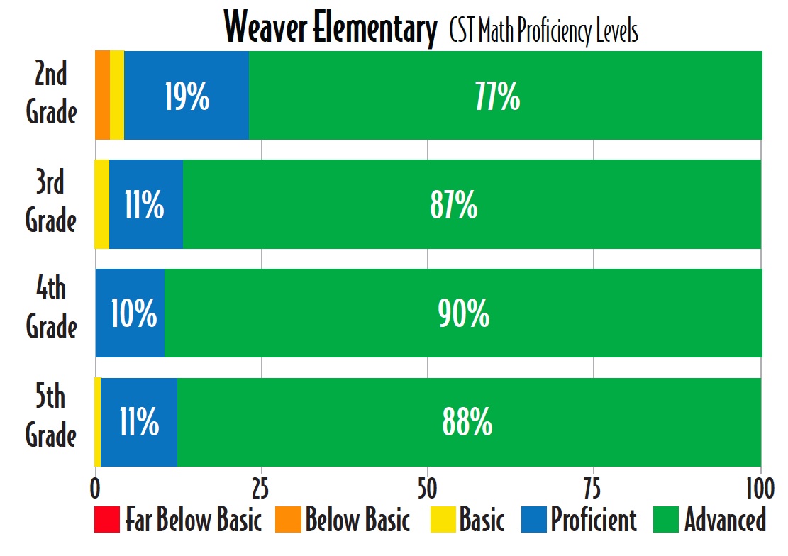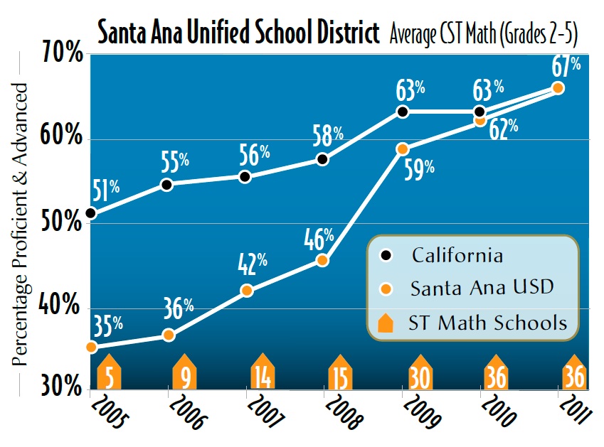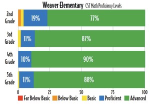 A second example is from the Los Alamitos Unified district. Weaver Elementary, under the leadership of principal Erin Kominsky, has been using ST Math software since 2000. In 2011, Weaver averaged 99% of its students proficient, with grade 4 100% proficient. 85% of Weaver’s students tested into that pre-Engineering Advanced level of math, with over 80 students scoring a perfect 600/600 in 2011.